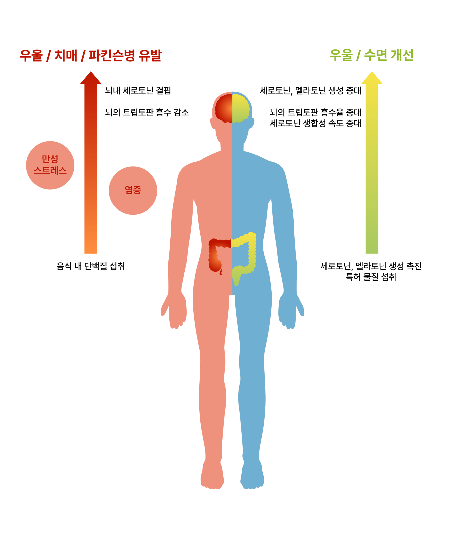 그러나 만성 스트레스와 체내 염증들은 음식으로 섭취된 트립토판이 뇌로의 흡수를 감소시키며 세로토닌 결핍으로 이어집니다.