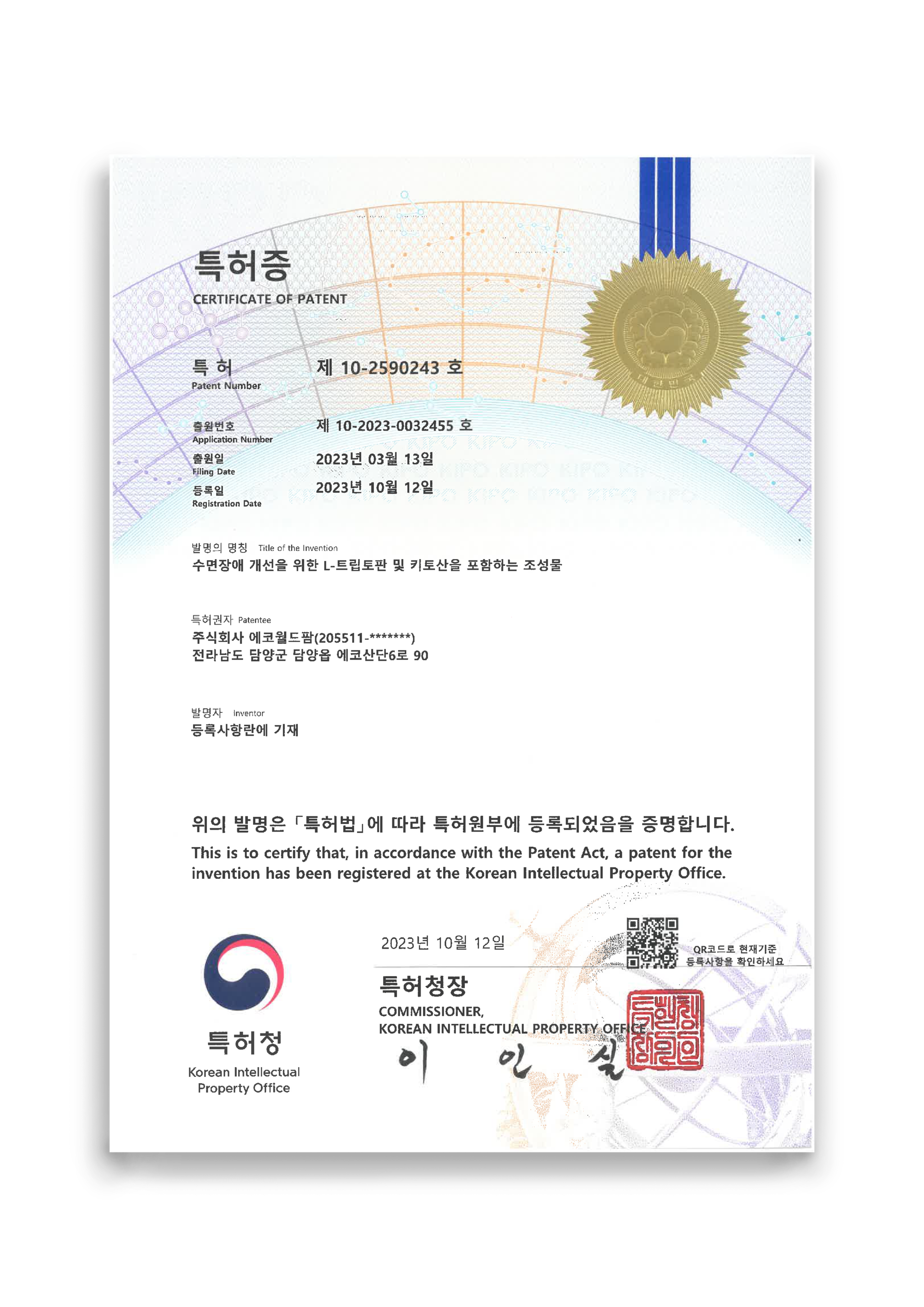 에코월드팜이 특허 받은 트립토판 조성 물질은